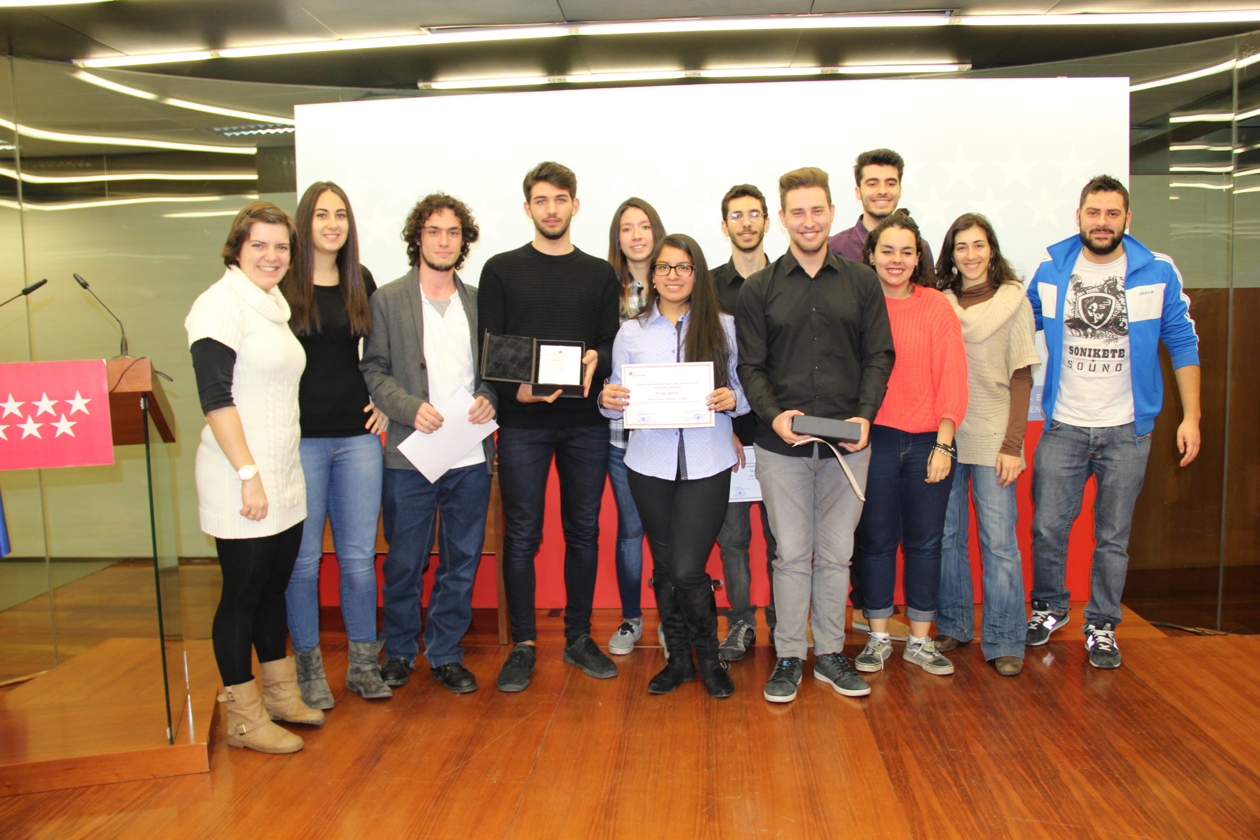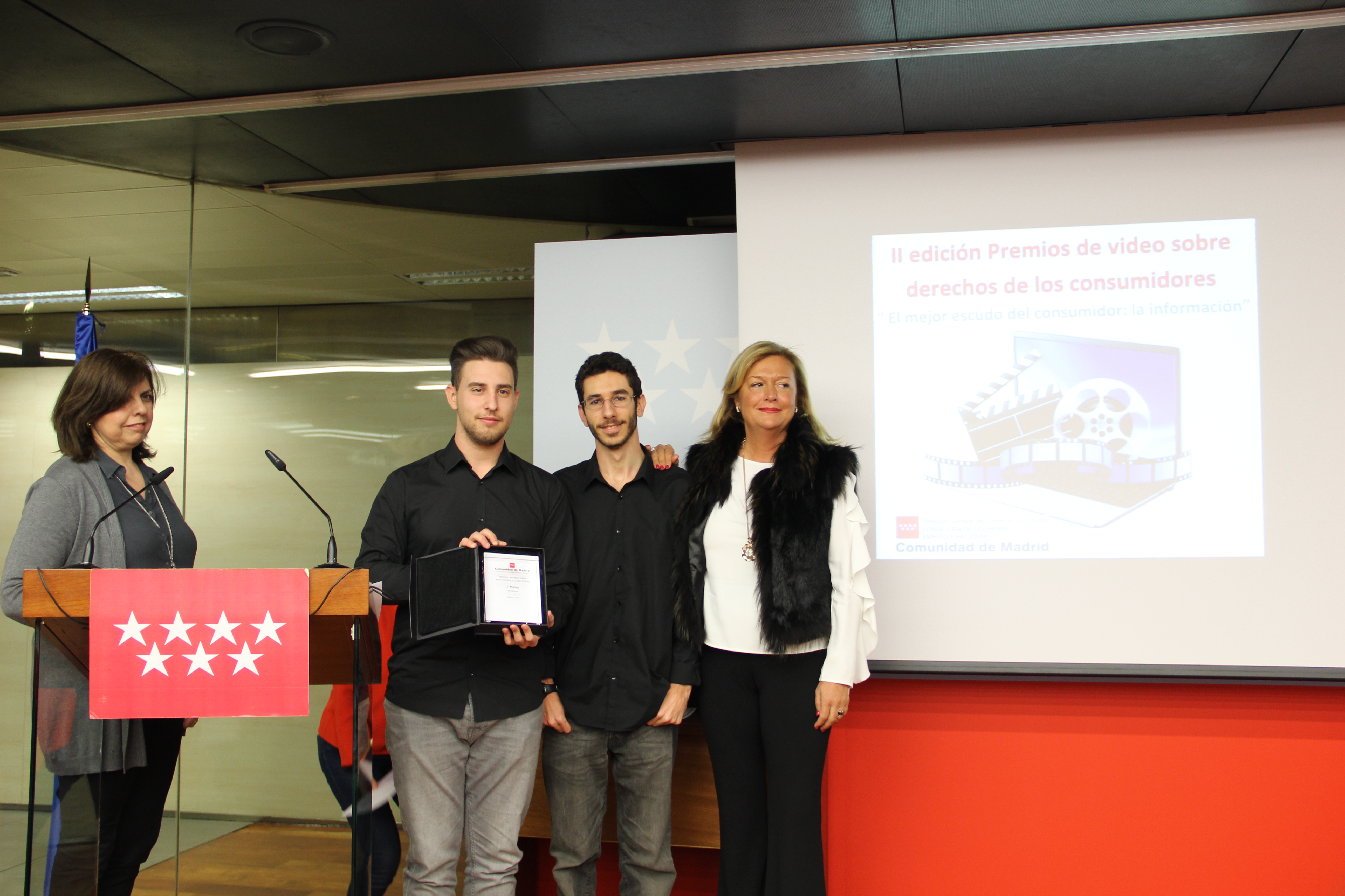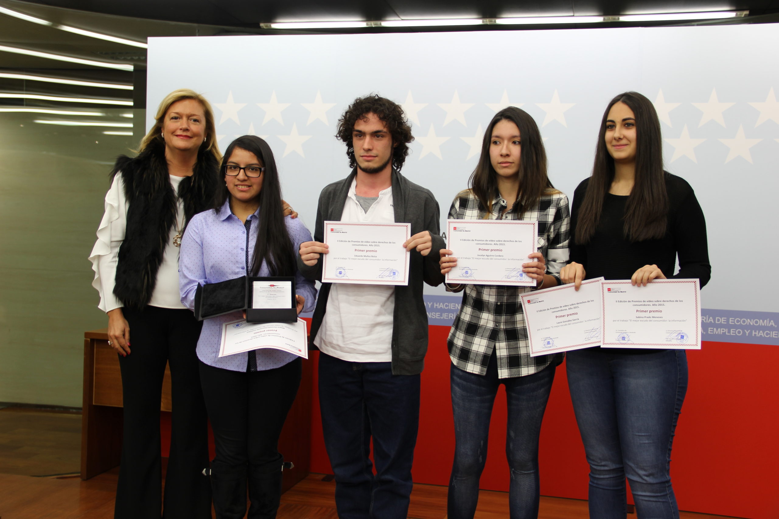 Tras el visionado de los vídeos se ha procedido a la entrega de los premios. Primer premio, consistente en 2.500 euros, para Mayra Christell Chamache Cachique, Eduardo Muñoz Boiza, Laura González García, Jocelyn Aguirre Cordero, Sabina Prado Meneses, María Saraiba Salas y Guillermo Loaisa Díaz miembros del equipo autor del vídeo titulado “El mejor escudo del consumidor: la información”.