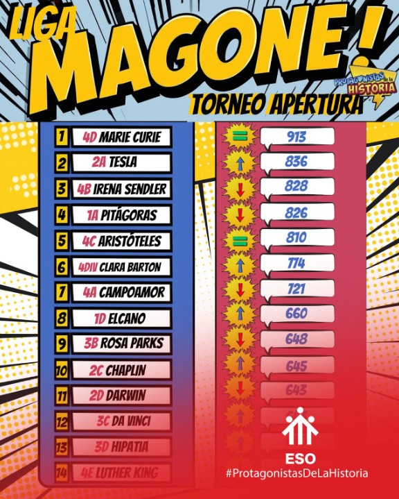 La Liga Magone, la liga de los valores, sigue creciendo en intensidad entre las aulas de Secundaria, donde cada grupo compite por destacar no solo en buenas acciones, sino también en el cuidado de las clases, la limpieza, la puntualidad y el comportamiento diario. La clasificación se mueve constantemente porque todos los cursos se muestran tremendamente competitivos y buscan superarse semana tras semana. Lo más significativo es comprobar cómo este espíritu de mejora compartida convierte cada gesto positivo en un paso adelante, fortaleciendo la convivencia y recordando que ser mejores empieza por las pequeñas acciones de cada día y les hace ser verdaderos #ProtagonistasDeLaHistoria.